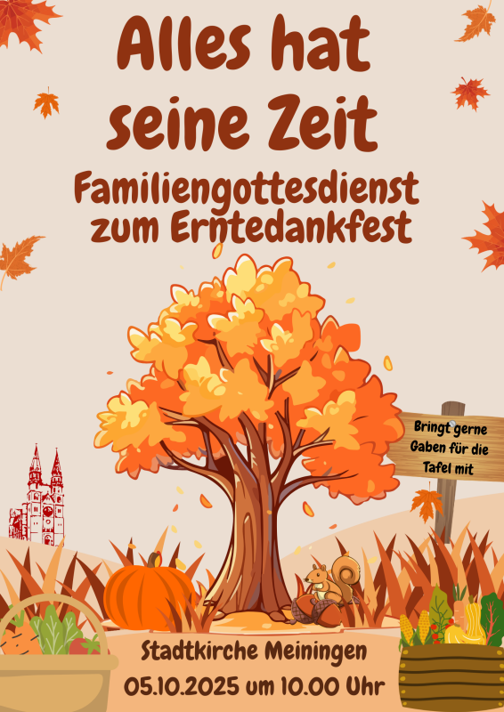 Herzliche Einladung zum Erntedankgottesdienst Sonntag, 5.Okt. 2025 um 10 Uhr in die Stadtkirche Meiningen.